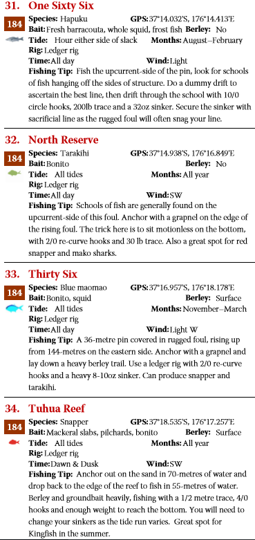 Edition:1st Edition: Map Page 184 Spot (31) One Sixty Six, Spot (32) North Reserve, Spot (33) Thirty Six and Spot (34) Tuhua Reef are showing on the map but not printed in the book. Click here for detail on these spots.